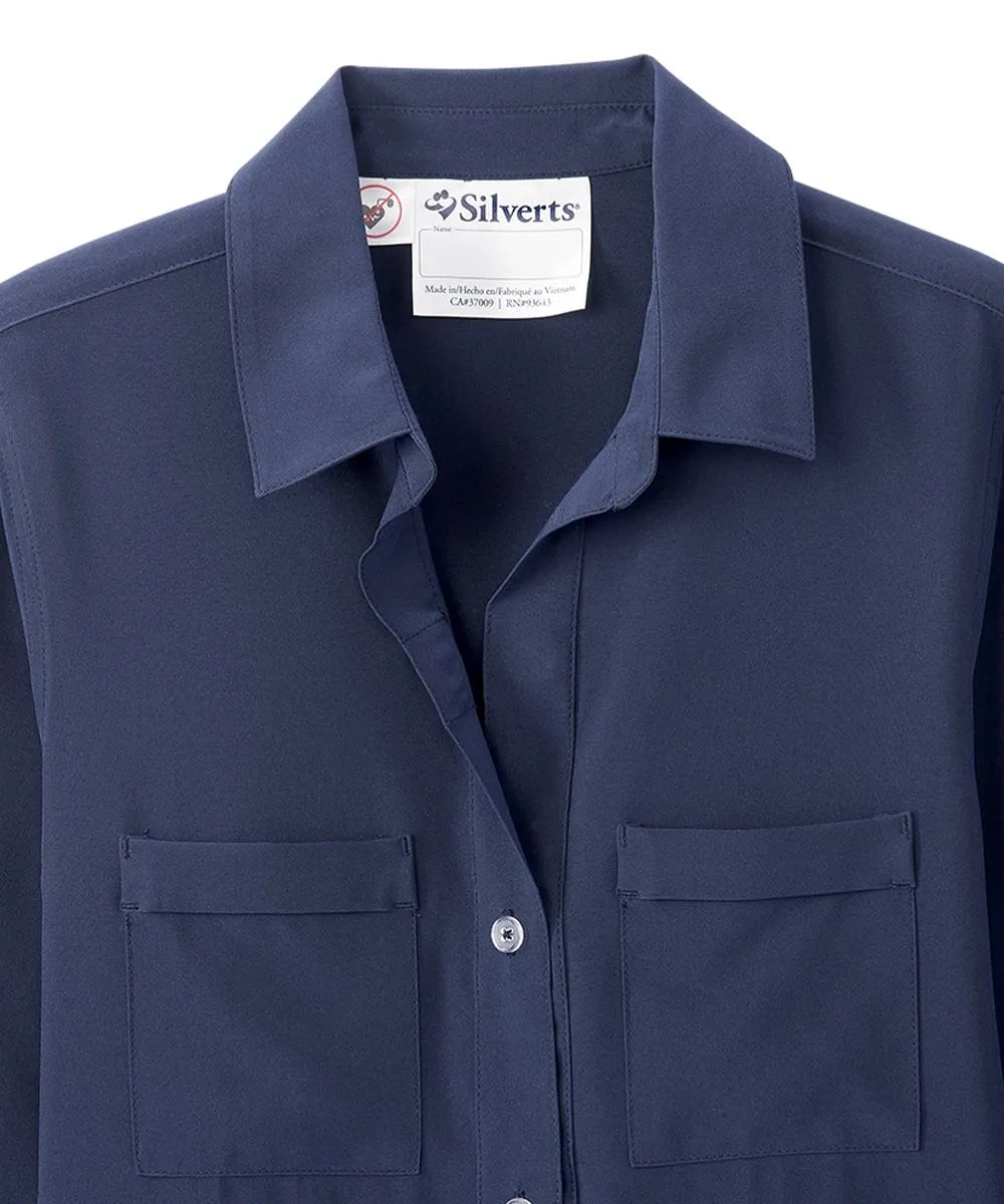 Fashion Meets Function: This elegant blouse offers a seamless fusion of style and practicality. The faux-button placket and cuffs cleverly hide magnetic closures, simplifying the dressing process. You'll appreciate the chic Y-neckline and the added convenience of two pockets. With side slits for a graceful drape while sitting, and an inverted back pleat for enhanced comfort and mobility.